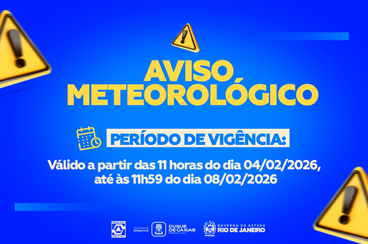A prefeitura de Duque de Caxias, por meio da Defesa Civil, divulga Aviso Metrológico válido a partir das 11h desta quarta-feira, 04/02/2026, até 11h59 da segunda-feira, 09/02/2026. A aproximação de uma frente fria associada à formação de uma Zona de Convergência do Atlântico Sul (ZCAS), ocasionarão, a partir do final da manhã desta quarta-feira (04/02), pancadas de chuvas de intensidade moderada à localmente forte, podendo ser acompanhadas de rajadas de ventos e raios em áreas do município. ...
