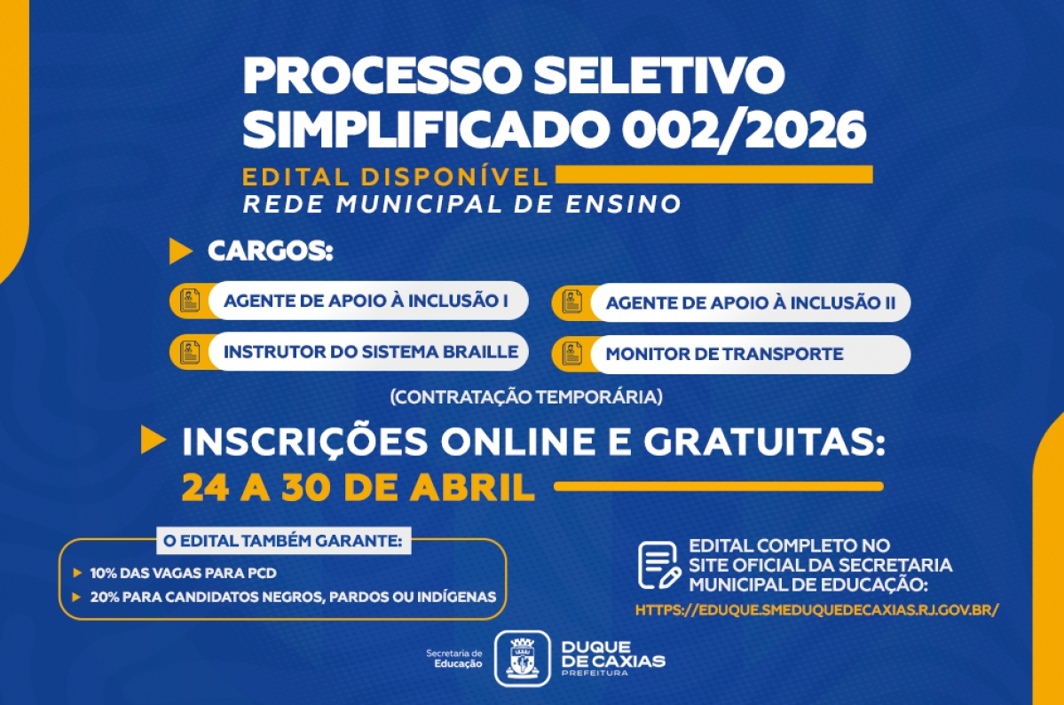 A Prefeitura de Duque de Caxias, por meio da Secretaria Municipal de Educação, divulgou nesta quarta-feira (22/04) o Edital nº 002/2026, que abre inscrições para o Processo Seletivo Simplificado (PSS) destinado à contratação temporária de profissionais....